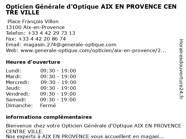 1 Générale d’Optique (Distance: 0,03 km) 50 Place François Villon, 13100 Aix-en-Provence boutique de chaussures, d’optique, femme, générale, luxe homme 2 Générale d'Optique (Distance: 0,05 km) 605 Avenue Max Juvénal, 13100 Aix-en-Provence d'optique, générale 3 Société Générale (Distance: 0,17 km) 65 Avenue Giuseppe Verdi, 13100 Aix-en-Provence agence, devis d'assurance automobile, générale, prêt à domicile, prêt à la consommation, société 4 Dr. Jean Pierre Guichard - Médecine générale (Consultation sur rendez-vous) (Distance: 0,26 km) 27 Rue Lisse des Cordeliers, 13100 Aix-en Provence consultation, docteur, dr., guichard, générale, jean, médecine, pierre, rendez, santé, sur, vous 5 Opticien Mobile - AIX-EN-PROVENCE Optical Center (Distance: 0,26 km) 9 Avenue Victor Hugo, 13100 Aix-en-Provence aix, center, en, mobile, optical, opticien, provence 6 Opticien AIX-EN-PROVENCE Optical Center (Distance: 0,26 km) 9 Avenue Victor Hugo, 13100 Aix-en-Provence aix, center, en, optical, opticien, provence |