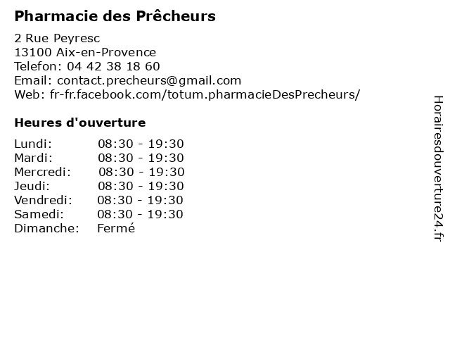 1 Orthopédie des Prêcheurs (Distance: 0,11 km) 2 rue Peyresc, 13100 Aix en Provence des, location, matériel, médical, orthopédie, prêcheurs, vente 2 Hammam des Prêcheurs (Distance: 0,24 km) 10 Rue Félicien David, 13100 Aix-en-Provence bien-etre, centre, centre de massage, des, hammam, institut, massages, prêcheurs, santé 3 Sushi Shop Aix-en-Provence Prêcheurs (Distance: 0,24 km) 18 Rue Thiers, 13100 Aix en Provence aix, en, provence, prêcheurs, shop, sushi 4 Pharmacie des Cardeurs (Distance: 0,11 km) 22 Rue Vauvenargues, 13100 Aix-en-Provence cardeurs, des, herboristerie, médicaments, paramédical, parapharmacie, pharmacie, pharmacien, santé, traitements 5 Pharmacie du Roy René (Distance: 0,61 km) 1 Bis Cours d'Orbitelle, 13100 Aix-en-Provence du, herboristerie, médicaments, paramédical, parapharmacie, pharmacie, pharmacien, rené, roy, santé, traitements 6 Pharmacie du Roy René (Distance: 0,61 km) 1 Bis Cours d'Orbitelle, 13100 Aix-en-Provence du, herboristerie, médicaments, paramédical, parapharmacie, pharmacie, pharmacien, rené, roy, santé, traitements |