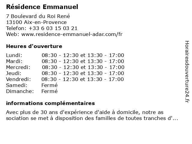 | Mercredi | 08:30-12:30 et 13:30-17:00 |