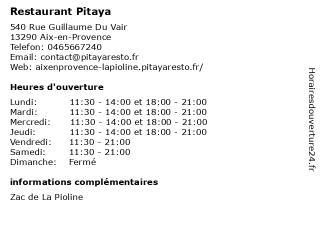 1 Restaurant Pitaya (Distance: 4,13 km) 1 Bis Cours Mirabeau, 13100 Aix-en-Provence cuisine, menus, pitaya, plat, repas, restaurant, thaïlandaise 2 Restaurant Pitaya (Distance: 10,71 km) 1496 Avenue du Plan de Campagne, 13170 Les Pennes-Mirabeau cuisine, menus, pitaya, plat, repas, restaurant, thaïlandaise 3 Pitaya Thaï Street Food (Distance: 4,14 km) 1 bis Cours Mirabeau, 13100 AIx-en-Provence bar & gril, café, food, pitaya, restaurants, service de livraison de repas à domicile, street, thaï 4 Restaurant Pitaya (Distance: 22,54 km) 9 Quai du Lazaret, 13002 Marseille cuisine, menus, pitaya, plat, repas, restaurant, thaïlandaise 5 Restaurant Pitaya (Distance: 22,79 km) 64 Boulevard de la Blancarde, 13004 Marseille cuisine, menus, pitaya, plat, repas, restaurant, thaïlandaise 6 Maison Calambo (Distance: 22,92 km) 2 Avenue du Maréchal Foch, 13004 Marseille bar à fruits de mer, calambo, fruits de mer, huitre, maison, plat cuisiné à emporter, plateau de fruits de mer, restaurant, restaurant de fruits de mer, restaurant de poissons, traiteur |