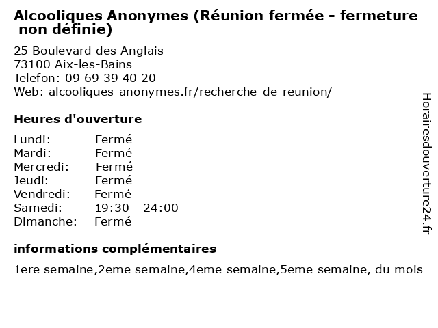 Termes de recherche pour Alcooliques Anonymes (Réunion fermée - fermeture non définie):reunion, non, fermeture, alcooliques, anonymes, définie, fermée |