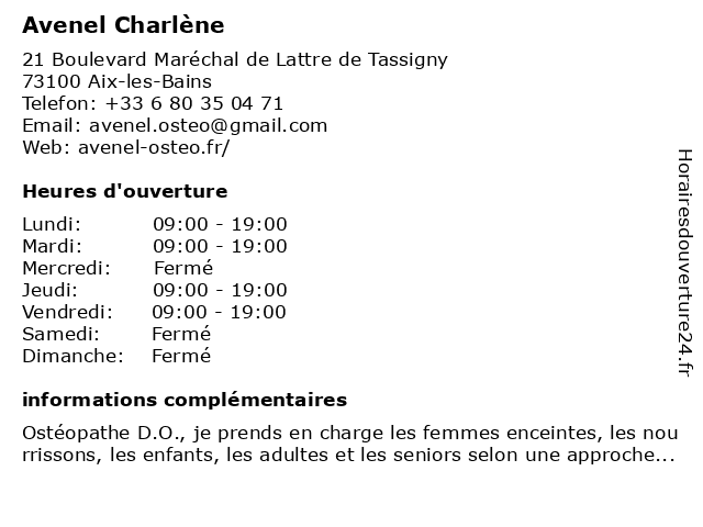 1 Charlène Decarpigny - Ostéopathe (Distance: 14,09 km) 157 Rue Chanoine Henri Fejoz, 73000 Bassens actes et symptômes, charlene, charlène, decarpigny, expertises, ostéopathe, ostéopathie de la femme enceinte, ostéopathie pédiatrique 2 Maître Charlène Delecourt - Avocate (Distance: 28,94 km) 22 Bis rue de la Paix, 74000 Annecy avocat, avocate, avocats, charlène, civils, delecourt, droits, juridiques, maître 4 Cabinet de Chiropraxie - Besset Charlène DC (Distance: 30,97 km) 22 bis Avenue du Centenaire, 73110 La Rochette articulation, besset, cabinet, charlène, chiropraxie, dc, de, la, médical, rochette, santé 5 L'Institut De Charlène (Distance: 56,32 km) 522 Grande Rue, 74930 Reignier-Esery charlène, de, l'institut 6 |