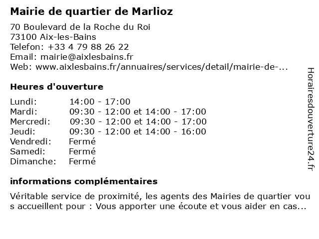 | Mardi | 09:30-12:00 et 14:00-17:00 |