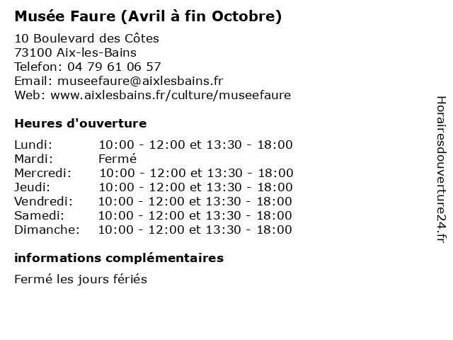Dimanche | 10:00-12:00 et 13:30-18:00 |