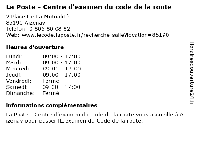 Termes de recherche pour La Poste - Centre d'examen du code de la route:poste, la, du, de, route, centre, code, d'examen, centre d'évaluation scolaire, école technique |