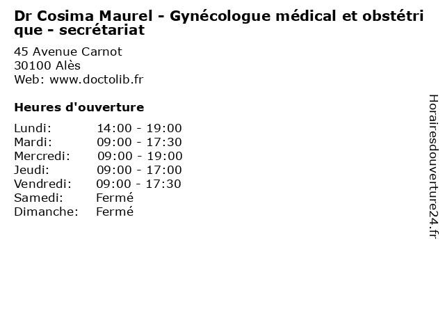 1 Dr Angélika Heuer - Gynécologue médical et obstétrique - secrétariat (Distance: 0,00 km) 45 Avenue Carnot, 30100 Alés angelika, angélika, consultation, docteur, dr, et, gynécologue, heuer, med, médecin, médecine, médical, obstétrique, secrétariat, traitement 2 Dr François Maurel - Pneumologue (Distance: 0,12 km) 45 Avenue Carnot, 30100 Ales consultation, docteur, dr, du, françois, maurel, pathologie, pneumologie, pneumologue, rendez, respiratoire, réhabilitation, santé, sommeil, sur, tabacologie, vous 3 Cabinet médical Cardio Carnot - Cardiologie (secrétariat ) (Distance: 0,36 km) 18 Avenue Carnot, 30100 Alès cabinet, cardio, cardiologie, carnot, consultation, docteur, médical, santé, secrétariat 4 Cabinet Médical du Docteur Bognie (secrétariat ) (Distance: 1,14 km) 38 Quai Boissier de Sauvages, 30100 Alès bognie, cabinet, consultation, docteur, du, médecins, médical, santé, secrétariat 5 Dr Maurice Cohen - Gynécologue obstétricien (Distance: 1,83 km) 1655 Chemin de Trespeaux, 30100 Alès bebe, cohen, dr, gynecologie, gynécologue, maternite, maurice, obstetrique, obstétricien 6 Dr David Emmanuel Broche - Gynécologue médical et obstétrique (Distance: 2,60 km) 811 Avenue Dr Jean Goubert, 30100 Ales broche, consultation, david, docteur, dr, emmanuel, et, gynécologue, med, médecin, médical, obstétrique, traitement |