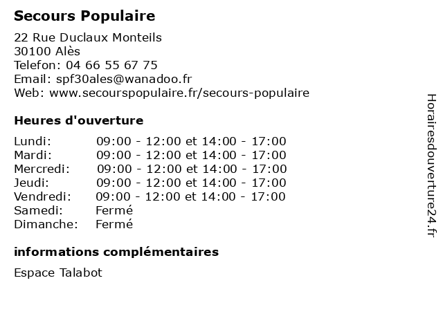 | Mercredi | 09:00-12:00 et 14:00-17:00 |
