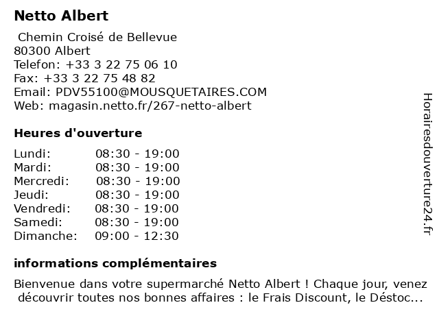 1 Netto (Distance: 1,79 km) s/n Rue De L'industrie, 80300 Albert alimentaire, destockage, magasins, netto, produits, supermarchés 2 Netto (Distance: 28,33 km) - Pierre, 80260 Flesselles achats de produits alimentaires, des prix bas, grands supermarchés, hard discount, netto, supermarchés 3 Netto Flesselles (Distance: 28,47 km) Rd 933 Le champs Saint Pierre, 80260 Flesselles flesselles, netto 4 Netto Station Service (Distance: 28,48 km) - Route Départementale 933, 80260 Flesselles carburant, essences, gazole, netto, service, services, station 5 Netto Station Service (Distance: 30,60 km) 495 Route d'Abbeville, 80000 Amiens carburant, essences, gazole, netto, service, services, station 6 |