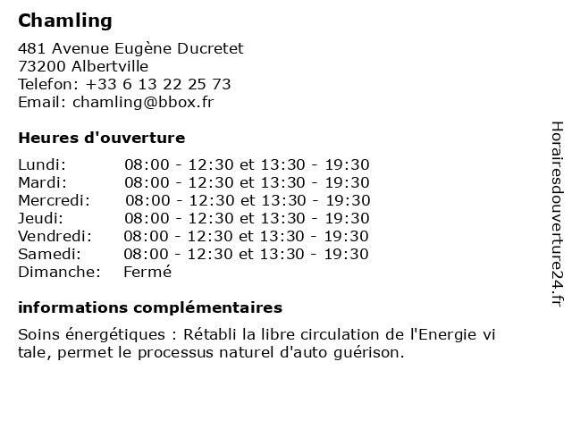 | Samedi | 08:00-12:30 et 13:30-19:30 |