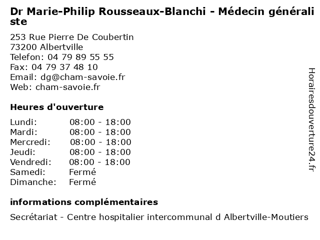 2 La Savoie Faire (Distance: 47,77 km) Le Savoie Faire, 74400 Chamonix Mont Blanc chamonixchef, faire, jones, philip, restaurants, savoie 3 Sarl Philip'Alarme (Distance: 50,71 km) 260 Impasse des Grandes Charrieres, 74270 Musièges philip'alarme, sarl 4 Marie-Aude Coste - Sage-femme (Distance: 0,00 km) 253 Rue Pierre De Coubertin, 73200 Albertville aude, consultation, coste, docteur, dr, femme, marie, med, médecin, sage, traitement 5 Dr Marie-Victoire Albahary - Pneumologue (Distance: 0,00 km) 253 Rue Pierre De Coubertin, 73200 Albertville albahary, consultation, docteur, dr, marie, med, médecin, pneumologue, traitement, victoire 6 Dr Marie-Frédérique Pinturier - Pédiatre (Distance: 0,00 km) 253 Rue Pierre De Coubertin, 73200 Albertville consultation, docteur, dr, frederique, frédérique, marie, med, médecin, pinturier, pédiatre, traitement |