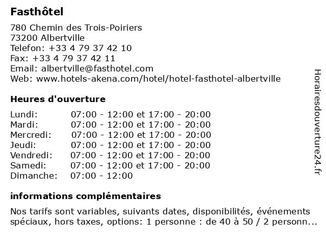 1 Fasthôtel (Distance: 0,02 km) 780 Chemin des Trois Poiriers, 73200 Albertville bar, chambres, fasthôtel, hotel, restaurant, service 2 Fasthôtel (Réception) (Distance: 24,82 km) 1 allée François Cochat, 74230 Thones fasthôtel, hebergement, hotel, réception, tourisme 3 Fasthôtel (Distance: 24,83 km) 1 Allée François Cochat, 74230 Thones bar, chambres, fasthôtel, hotel, restaurant, service 4 Fasthôtel (Réception) (Distance: 34,21 km) 2 Rue Gustave Eiffel, 74600 Seynod fasthôtel, hebergement, hotel, réception, tourisme 5 Fasthôtel (Distance: 38,01 km) 230 Rue des Epinettes, 73000 Chambéry bar, chambres, fasthôtel, hotel, restaurant, service 6 Fasthôtel (Réception) (Distance: 38,61 km) 230 rue des Epinettes, 73000 Chambéry fasthôtel, hebergement, hotel, réception, tourisme |