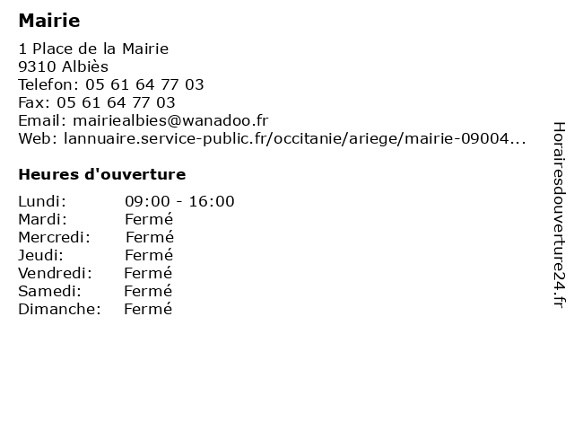 1 3 Mairie (Distance: 0,01 km) - Rue de la Mairie, 09310 Château-Verdun administration, mairie, public, service 5 Mairie (Distance: 2,27 km) - Place de la Païchère, 09310 Aston administration, mairie, public, service 6 Mairie (Distance: 2,85 km) - rue du Lavoir, 09310 Aulos administration, d'aulos, mairie, public, service |
