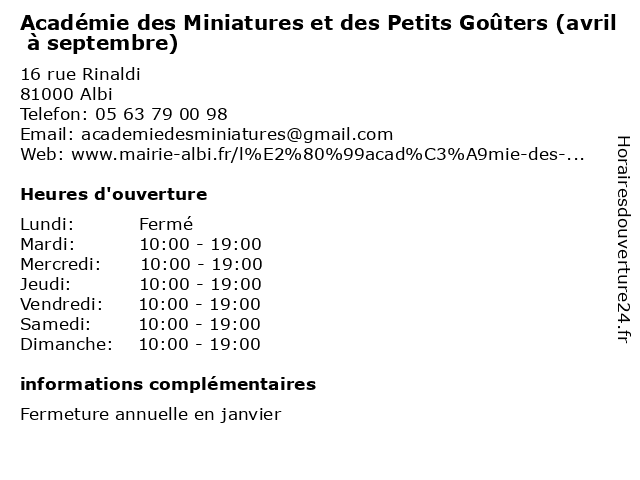1 Académie des Miniatures et des Petits Goûters (octobre à mars) (Distance: 0,00 km) 16 rue Rinaldi, 81000 Albi académie, accompagnement, decouverte, des, et, goûters, jardin terrasse, mars, miniatures, octobre, petits, salon de thé 2 Musée Lapérouse - du 1er Juin au 30 septembre (Distance: 0,19 km) 41 Rue Porta, 81000 Albi 1er, 30, août, armes, au, du, expositions, films, juillet, juin, lapérouse, musée, navigateurs, sept, septembre, uniformes, vestiges 3 Musée Lapérouse - Avril-Mai-Octobre (Distance: 0,37 km) 41 Rue Porta, 81000 Albi armes, avril, expositions, films, lapérouse, mai, musée, navigateurs, octobre, uniformes, vestiges 4 Musée Toulouse-Lautrec (Du 21 juin au 30 septembre ) (Distance: 0,39 km) - Place Sainte Cécile, 81003 Albi Cedex 21, 30, ancien, art, au, du, exposition, histoire, juin, lautrec, livre, monument, musée, savoir, septembre, toulouse 5 Musée Toulouse-Lautrec (Avril-mai) (Distance: 0,39 km) - Place Sainte Cécile, 81003 Albi Cedex ancien, art, avril, exposition, histoire, lautrec, livre, mai, monument, musée, savoir, toulouse 6 Musée pour Tous Raphaël Cordoba - Mai à septembre (Distance: 0,66 km) 38 rue de l'Hôtel de Ville, 81000 Albi cordoba, decouvertes, explications, mai, musée, pour, raphaël, reproductions, septembre, toiles, tous |