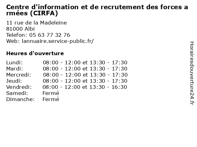 Termes de recherche pour Centre d'information et de recrutement des forces armées (CIRFA):albi, et, de, des, administration, services, centre, recrutement, publics, d'information, armées, cirfa, organismes, forces |