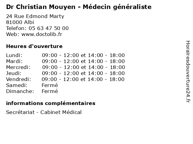 | Mercredi | 09:00-12:00 et 14:00-18:00 |