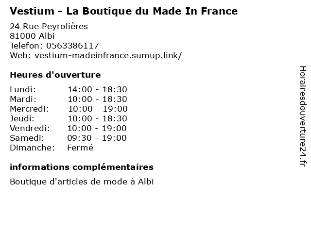 1 Vestium - Made In France (Distance: 0,00 km) 24 Rue Peyrolières, 81000 Albi accessoires, boutique, france, habillements, in, made, mode, vestium, vêtements 2 B2m - Boutique 2 Mode (Distance: 0,18 km) 51 Rue Séré de Rivières, 81000 Albi accessoires, b2m, boutique, chaussures, magasin, maroquinerie, mode, vêtements 3 Boutique Orange Centre - Albi (Distance: 0,33 km) 11 Rue Timbal, 81000 Albi albi, boutique, centre, orange 4 Boutique Etoile (Distance: 0,42 km) 6 Rue de l'Oulmet, 81000 Albi accessoires, albi, boutique, etoile, femme, mode, vêtements 5 Boutique Flo (Distance: 0,47 km) 27 Rue Mariés, 81000 Albi accessoires, boutique, flo, habillement, mode, pret-à-porter, vêtements 6 Training Boutique (Distance: 0,52 km) 1 Place Saint Julien, 81000 Albi accessoires, boutique, homme, magasin, training, vêtements |