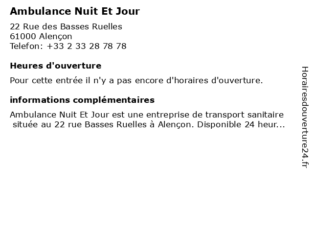 1 Ambulance Nuit Et Jour (Distance: 8,17 km) 5 Rue du Stade, 72610 Oisseau-le-Petit ambulance, et, jour, nuit 2 Ambulance Nuit Et Jour (Distance: 16,44 km) 30 Rue de Spilsby, 72130 Fresnay-sur-Sarthe ambulance, et, jour, nuit 3 Un Jour Ailleurs (Distance: 0,68 km) 50 Grande Rue, 61000 Alençon accessoires, ailleurs, chaussures, habillement, jour, mode, un 4 École primaire publique Point du jour (Distance: 1,88 km) 19 Rue Pierre et Marie Curie, 61000 Alençon cours, du, education, jour, point, primaire, publique, services, École, école 5 Le Bayokos (Distance: 0,69 km) 25 Cours Clémenceau, 61000 Alençon ambiance, bayokos, boissons, boite de nuit, club, discothèque, débits, le, soirée 6 RougeGorge (Distance: 37,12 km) 21 Rue Pierre Bérégovoy, 61200 Argentan accessoires, boutique, lingerie, mode femme, nuit, rougegorge  |