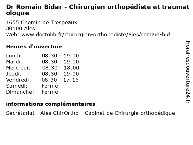 1 Dr Jean Sébastien Karp - Chirurgien orthopédiste et traumatologue (Distance: 0,00 km) 1655 Chemin de Trespeaux, 30100 Alès alès, cabinet, chirortho, chirurgie, chirurgien, de, dr, et, jean, karp, orthopedie, orthopédique, orthopédiste, sébastien, trauma, traumatologie, traumatologique, traumatologue 2 Dr Philippe Duchemin - Chirurgien orthopédiste et traumatologue (Distance: 0,00 km) 1655 Chemin de Trespeaux, 30100 Alès alès, cabinet, chirortho, chirurgie, chirurgien, de, dr, duchemin, et, orthopedie, orthopédique, orthopédiste, philippe, trauma, traumatologie, traumatologique, traumatologue 3 Dr Xavier Nicolay - Chirurgien orthopédiste et traumatologue (Distance: 0,00 km) 1655 Chemin de Trespeaux, 30100 Alès alès, cabinet, chirortho, chirurgie, chirurgien, de, dr, et, nicolay, orthopedie, orthopédique, orthopédiste, trauma, traumatologie, traumatologique, traumatologue, xavier 4 École élémentaire publique Romain Rolland (Distance: 2,48 km) . Esplanade de Clavières, 30100 Alès cours, education, publique, rolland, romain, services, école, élémentaire 5 École maternelle publique Romain Rolland (Distance: 2,58 km) . Rue des Peupliers, 30100 Alès cours, education, maternelle, publique, rolland, romain, services, école 6 Dr Hynek Bata - Chirurgien orthopédiste et traumatologue (Distance: 3,32 km) 811 Avenue Dr Jean Goubert, 30100 Ales bata, chirurgien, consultation, docteur, dr, et, hynek, med, médecin, orthopédiste, traitement, traumatologue |