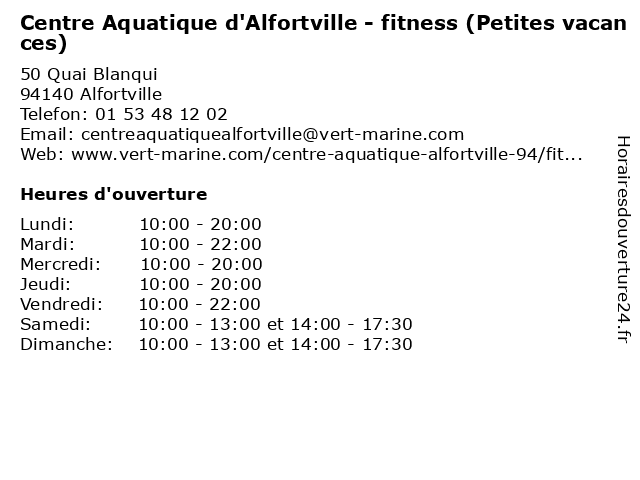1 Centre Aquatique d'Alfortville - l'espace aquatique (Périodes scolaires) (Distance: 0,00 km) 50 Quai Blanqui, 94140 Alfortville aqua, aquatique, centre, d'alfortville, l'espace, piscine, périodes, scolaires 2 Centre Aquatique d'Alfortville - l'espace aquatique (Petites vacances) (Distance: 0,00 km) 50 Quai Blanqui, 94140 Alfortville aqua, aquatique, centre, d'alfortville, l'espace, petites, piscine, vacances 3 Centre Aquatique d'Alfortville - bien-être (Petites vacances) (Distance: 0,00 km) 50 Quai Blanqui, 94140 Alfortville aqua, aquatique, bien, centre, d'alfortville, petites, piscine, vacances, être 4 Centre Aquatique d'Alfortville - fitness, bien-être (Périodes scolaires) (Distance: 0,00 km) 50 Quai Blanqui, 94140 Alfortville aqua, aquatique, bien, centre, d'alfortville, fitness, piscine, périodes, scolaires, être 5 Centre Aquatique d'Alfortville - l'espace aquatique, bien-être, fitness (Grandes vacances) (Distance: 0,00 km) 50 Quai Blanqui, 94140 Alfortville aqua, aquatique, bien, centre, d'alfortville, fitness, grandes, l'espace, piscine, vacances, être 6 Fédération départementale de la pêche et de la protection du milieu aquatique (Distance: 4,31 km) 4 Rue Étienne-Dolet, 94270 Le Kremlin-Bicêtre administration, aquatique, assoc, de, du, départementale, et, fédération, la, milieu, protection, pêche, services, services publics |