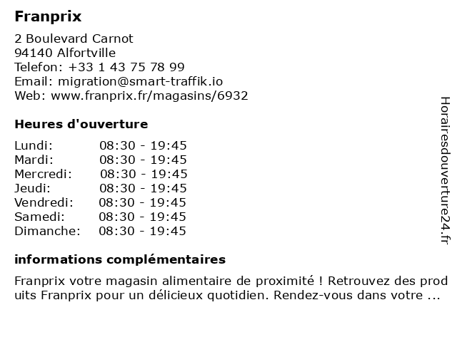 1 Franprix (Distance: 0,54 km) - rue de Londres, 94140 Alfortville alimentation générale, entretien de la maison et de l'hygiène, franprix, franprix magasin, fruits et légumes frais 2 Franprix (Distance: 0,99 km) 146 Rue Étienne Dolet, 94140 Alfortville bibi, carte de fidélité, courses, franprix, magasin, produits frais, programme de fidélité, supermarché, épicerie 3 Franprix (Distance: 0,99 km) 50 Rue Victor Hugo, 94140 Alfortville bibi, carte de fidélité, courses, franprix, magasin, produits frais, programme de fidélité, supermarché, épicerie 4 Franprix (Distance: 1,02 km) 146 rue Dolet, 94140 ALFORTVILLE alimentation générale, entretien de la maison et de l'hygiène, franprix, franprix magasin, fruits et légumes frais 5 Franprix (Distance: 1,74 km) 3 Avenue de la République, 94400 Vitry-sur-Seine bibi, carte de fidélité, courses, franprix, magasin, produits frais, programme de fidélité, supermarché, épicerie 6 Franprix (Distance: 4,09 km) 7-11 Boulevard Paul Vaillant Couturier, 94800 Villejuif bibi, carte de fidélité, courses, franprix, magasin, produits frais, programme de fidélité, supermarché, épicerie |