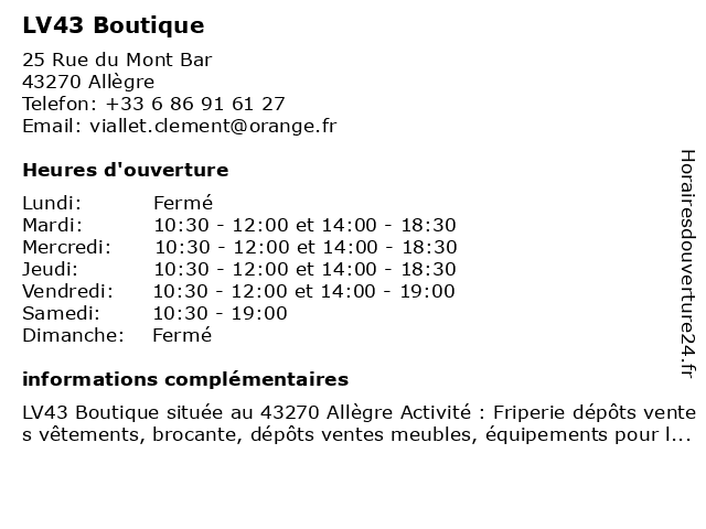 | Vendredi | 10:30-12:00 et 14:00-19:00 |