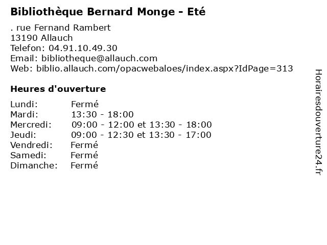 Termes de recherche pour Bibliothèque Bernard Monge - Eté:bernard, horaires, livres, bibliotheque, été, d'été, monge, revues, cd audio, cd.rom |