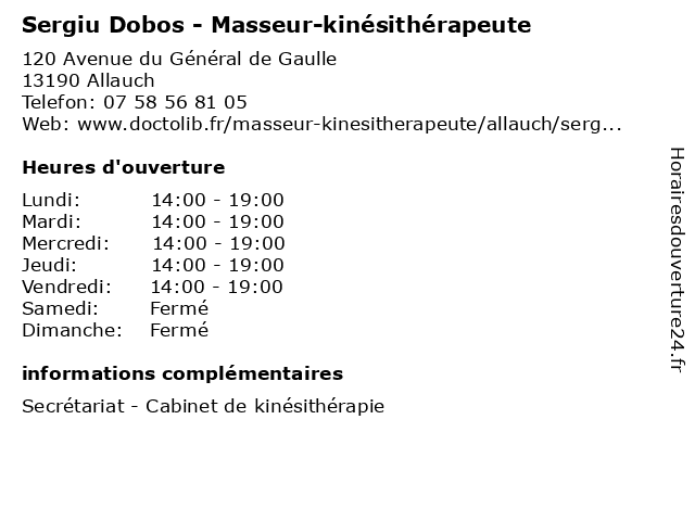 1 Dr Denise Clement - Médecin généraliste (Distance: 0,29 km) 8 Rue Du Pilon, 13190 Allauch clement, denise, docteur, dr, generaliste, généraliste, medical, médecin, soin 2 Franck Micheau - Ostéopathe (Distance: 0,41 km) 7 Avenue Jean Roques, 13190 Allauch bien-être, en, forme, franck, kinésithérapie, micheau, ostéopathe, remise, rééducation 3 Chloé Lasquellec - Masseur-kinésithérapeute (Distance: 0,54 km) - Avenue Jean Giono, 13190 Allauch chloé, kiné, kinésithérapeute, lasquellec, masseur, rééducation, soin 4 Théo Pembedjoglou - Masseur-kinésithérapeute (Distance: 0,54 km) - Avenue Jean Giono, 13190 Allauch kiné, kinésithérapeute, masseur, pembedjoglou, rééducation, soin, théo 5 Dimitri Pembedjoglou - Masseur-kinésithérapeute (Distance: 0,54 km) - Avenue Jean Giono, 13190 Allauch dimitri, docteur, kine, kinesitherapeute, kinésithérapeute, masseur, pembedjoglou 6 Dr Cécile Archambaud - Médecin généraliste (Distance: 0,60 km) - Avenue Jean Giono, 13190 Allauch archambaud, cécile, docteur, dr, generaliste, généraliste, medical, médecin, soin |