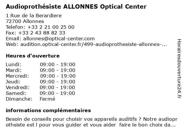 1 Optical Center - ALLONNES (Distance: 0,04 km) 1 Rue de la Berardiere, 72700 Allonnes allonnes, center, optical 2 Audioprothésiste LE MANS Optical Center (Distance: 4,65 km) 9-11 Rue Saint-Charles, 72000 Le Mans audioprothésiste, center, le, mans, optical 3 Opticien LE MANS Optical Center (Distance: 4,66 km) 9 Rue Saint-Charles, 72000 Le Mans center, le, mans, optical, opticien 4 Optical Center Mobile - Le Mans (Distance: 4,66 km) 9-11 Rue Saint-Charles, 72000 Le Mans center, le, mans, mobile, optical 5 Optical Center LE MANS SUD (Distance: 4,91 km) 11 Rue Roger de la Fresnaye, 72100 Le Mans center, le, mans, optical, sud 6 Optical Center LE MANS SUD (Distance: 4,91 km) 11 Rue Roger de la Fresnaye, 72100 Le Mans center, le, mans, optical, sud |