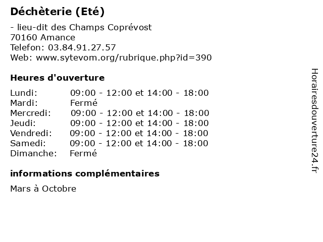 1 Déchèterie (Eté) (Distance: 12,29 km) - rue de Remaucourt, 70170 Port-sur-Saône bennes, débarras, déchèterie, détritus, eté, ordures, poubelles, été 2 Déchèterie (Eté) (Distance: 15,57 km) - lieu-dit Champs sur l'étang, 70210 Vauvillers bennes, débarras, déchèterie, détritus, eté, ordures, poubelles, été 3 Déchèterie (Eté) (Distance: 15,71 km) - lieu-dit La Corvée du Déchireux, 70360 Scey-sur-Saône-et-Saint-Albin bennes, débarras, déchèterie, détritus, eté, ordures, poubelles, été 4 Déchèterie (Eté) (Distance: 17,44 km) - lieu-dit Roux Poil, 70800 Saint-Loup-sur-Semouse bennes, débarras, déchèterie, détritus, eté, ordures, poubelles, été 5 Déchèterie (Hiver) (Distance: 0,00 km) - lieu-dit des Champs Coprévost, 70160 Amance bennes, débarras, déchèterie, détritus, hiver, ordures, poubelles 6 Déchèterie (du 01/03 au 31/10) (Distance: 4,65 km) - Champs, 70160 Amance 01/03, 31/10, au, du, déchèterie, gravats, huiles usées, la réception des déchets et écocentres, les appareils électroménagers, les déchets verts, papier et carton en quantité |