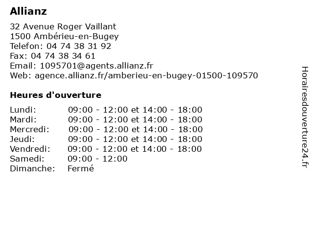 | 1 Allianz (Distance: 0,71 km) - Rue Alexandre Berard, 01500 Amberieu en Bugey agence, allianz, dont l’assurance auto, habitation, l’enseigne propose différents produits d’assurances, moto, retraite, vie, équipements 2 Allianz (Distance: 6,67 km) 36 Rue Pasteur, 01150 Lagnieu agence, allianz, assurance, auto, habitation, moto, produits d’assurances, retraite, vie 3 Allianz (Distance: 6,72 km) 147 Rue du Docteur Temporal, 01230 St-Rambert en Bugey agence, allianz, assurances 4 Allianz (Distance: 9,72 km) 1 Rue Brillat Savarin, 01160 Pont d'Ain agence, allianz, dont l’assurance auto, habitation, l’enseigne propose différents produits d’assurances, moto, retraite, vie, équipements 5 Allianz (Distance: 14,27 km) 3 Rue de Genève, 01800 Meximieux agence, allianz, assurance prêt, assurances, assurancesaservices 6 |