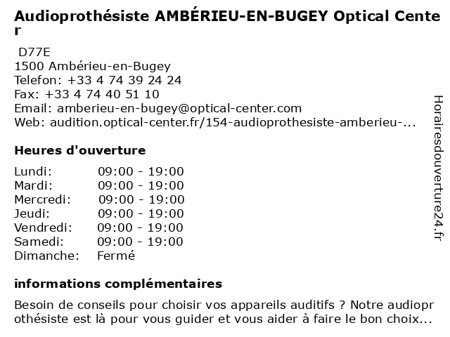 1 Opticien AMBÉRIEU-EN-BUGEY Optical Center (Distance: 0,00 km) D77E, 01500 Ambérieu-en-Bugey ambérieu, bugey, center, en, optical, opticien 2 Audika - Audioprothésiste Ambérieu (Distance: 2,32 km) 15 Rue de la République, 01500 Ambérieu-en-Bugey ambérieu, appareil auditif, audika, audiologiste, audioprothésiste, centre auditif, spécialiste audition 3 Amplifon Audioprothésiste Ambérieu (Distance: 2,43 km) 18 Rue Alexandre Bérard, 01500 Ambérieu en Bugey ambérieu, amplifon, audiologie, audioprothésiste 4 Amplifon Audioprothésiste Lagnieu (Distance: 7,82 km) 15 Rue Pasteur, 01150 Lagnieu amplifon, audiologie, audioprothésiste, lagnieu 5 Amplifon Audioprothésiste Meximieux (Distance: 13,86 km) 39 Rue De Lyon, 01800 Meximieux amplifon, audiologie, audioprothésiste, meximieux, nez, oreilles & gorge, oto-rhino-laryngologie (orl) 6 Optical Center (Distance: 37,63 km) 86 Avenue du Général Leclerc, 69300 Caluire et Cuire center, lentilles de contact, mode, optical, optique.lunettes de soleil |