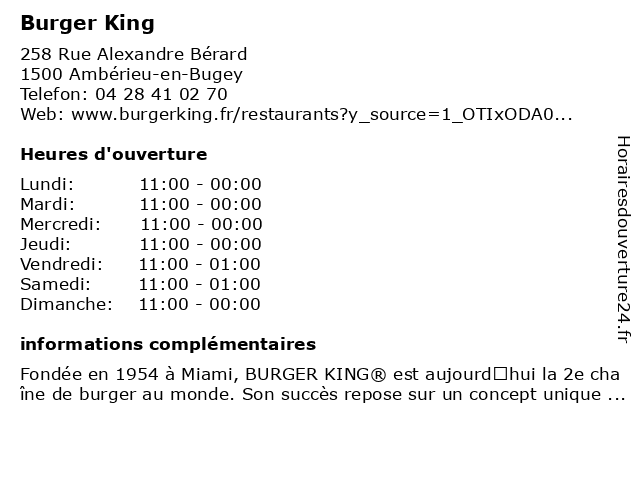 1 Burger King (Distance: 14,76 km) 174 Chemin Des Verchères, 01800 Meximieux bar & gril, burger, king, restaurant américain, restaurant de hamburgers, restaurant familial, restaurant à emporter 2 King Jouet (Distance: 2,20 km) . Zone d'activités Portes du Bugey, 01500 Amberieu-en-Bugey enfants, figurines, jeux, jeux videos, jouet, jouets, king, loisirs, maxi, poupées, toys, éducatif 3 King Family Burger (Distance: 2,31 km) 2 Rue Amedee Bonnet, 01500 Amberieu En Bugey burger, family, kevin, king, lelys, restaurants 5 King Jouet (Distance: 14,25 km) - Rue des Carronnières, 01800 Meximieux activités, cadeaux, enfants, jeux, jouet, king, magasin 6 Au Bureau (Distance: 0,81 km) 2020 Route D'ambérieu, 01500 Ambronay au, bar, bar sportif, bureau, pub, restaurant de hamburgers, restaurant européen, restaurant français, restaurant irlandais, taverne  |