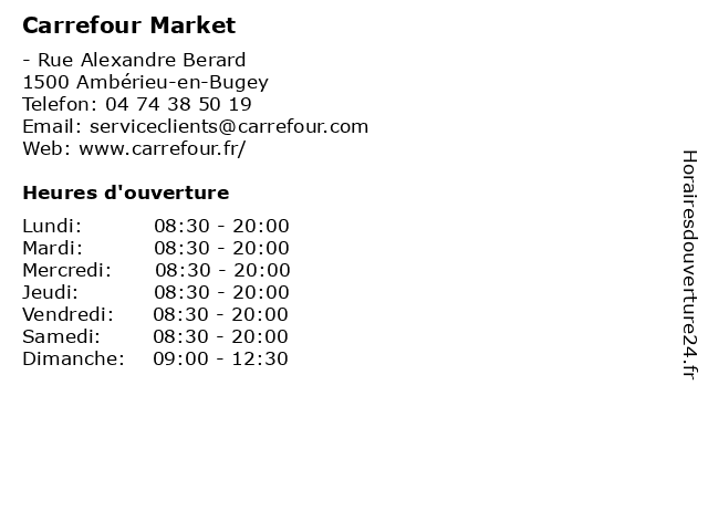 1 Carrefour Market (Distance: 6,36 km) 8 Rue De L'Industrie, 01150 Lagnieu carrefour, hypermarche, marche, market 2 Carrefour Market (Distance: 9,25 km) - Route Nationale 75, 38390 Montalieu Vercieu alimentation, carrefour, magasin discount, market, supermarché 3 Carrefour Market (Distance: 15,42 km) . Route De Lyon, 01800 Meximieux alimentation, carrefour, magasin discount, market, supermarché 4 Carrefour Market (Distance: 18,78 km) . Rue Masonod, 01110 Hauteville Lompnes carrefour, hypermarche, marche, market 5 Carrefour Market Drive (Distance: 0,00 km) . Rue Alexandre Bérard, 01500 Amberieu-en-Bugey carrefour, drive, marche, market, services, supermarche 6 Carrefour Location Market (Distance: 6,35 km) 8 Rue de l’industrie, 01150 Lagnieu automobiles, carrefour, déménagements, location, market, véhicules |