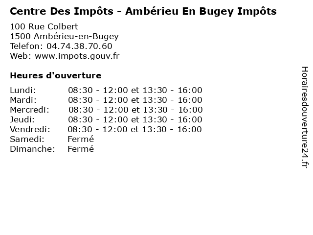 1 Centre Des Impôts - Ambérieu En Bugey Trésor Public (Distance: 0,04 km) 12 Rue Du Clos Dutillier, 01500 Ambérieu-en-Bugey ambérieu, bugey, centre, des, en, impôts, public, publics, services, trésor 2 Centre Des Impôts - Saint Rambert En Bugey Trésor Public (Distance: 6,12 km) 10 Rue De La Schappe, 01230 Saint-Rambert-en-Bugey bugey, centre, des, en, impôts, public, publics, rambert, saint, services, trésor 3 Centre Des Impôts - Lagnieu Trésor Public (Distance: 6,45 km) 4 Rue Du Recteur Perroud, 01150 Lagnieu centre, des, impôts, lagnieu, public, publics, services, trésor 4 Centre Des Impôts - Meximieux Trésor Public (Distance: 14,14 km) 3 Rue Du Ban Thévenin, 01800 Meximieux centre, des, impôts, meximieux, public, publics, services, trésor 5 Centre Des Impôts - Poncin Trésor Public (Distance: 14,39 km) 1 Avenue Du Parc, 01450 Poncin centre, des, impôts, poncin, public, publics, services, trésor 6 Centre Des Impôts - Bourg En Bresse Trésor Public (Distance: 28,41 km) 34 Rue Du Général Delestraint, 01000 Bourg-en-Bresse administration, assoc. - services publics, bourg, bresse, centre, des, en, impôts, public, trésor |