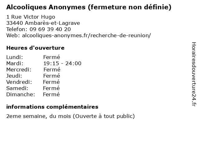 Termes de recherche pour Alcooliques Anonymes (fermeture non définie):reunion, non, fermeture, alcooliques, anonymes, définie |