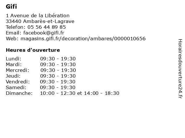 1 Gifi (Distance: 5,57 km) 10 Avenue du Millac, 33370 Artigues-près-Bordeaux ameublement, decoration, electromenager, gifi, maison 2 GiFi (Distance: 10,73 km) 80 Avenue Eiffel, 33240 Saint-André-de-Cubzac ameublement, déco, décoration, gifi, intérieur, maison, meubles 3 Gifi (Distance: 11,01 km) 1 Chemin de Vimeney, 33270 Floirac darty, divers, décoration, gifi, magasins 4 GiFi (Distance: 11,14 km) - Chemin de Vimeney, 33270 Floirac bureau, cuisine, décoration, gifi, jardin & plein air, salle à manger, salon, stockage - salle 5 Gifi (Distance: 11,19 km) . Rue de la Gabarre, 33270 Bouliac auchan, aushopping, bouliac, centre, commercial, gifi 6 GiFi (Distance: 11,78 km) 146-154 Cours Victor Hugo, 33000 Bordeaux ameublement, déco, décoration, gifi, intérieur, maison, meubles |