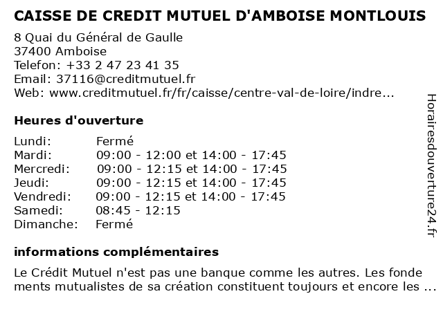 1 Crédit Mutuel (Distance: 0,01 km) 8 Quai Du General De Gaulle, 37400 Amboise compagnie de téléphone, crédit, mutuel, organisme d'assurance 2 Crédit Mutuel (Distance: 12,12 km) 12 Rue du Sénateur Belle, 37270 Montlouis-sur-Loire agence, assurance, bancaire, banque, crédit, mutuel 3 Crédit Mutuel (Distance: 12,12 km) 12 Rue Du Senateur Belle, 37270 Montlouis Sur Loire compagnie de téléphone, crédit, mutuel, organisme d'assurance 4 Crédit Mutuel (Distance: 17,16 km) 55 Rue Nationale, 41400 Montrichard Val De Cher compagnie de téléphone, crédit, mutuel, organisme d'assurance 5 CAISSE DE CREDIT MUTUEL DE CONTRES - MONTRICHARD (Distance: 17,16 km) 55 Rue Nationale, 41400 Montrichard Val de Cher caisse, contres, credit, de, montrichard, mutuel 6 Crédit Agricole Mutuel Pyrénées Gascogne (Distance: 19,65 km) 1040 Avenue du Général De Gaulle, 37550 Saint Avertin agricole, assurance, banque, credit, crédit, epargne, gascogne, mutuel, pyrénées, services |