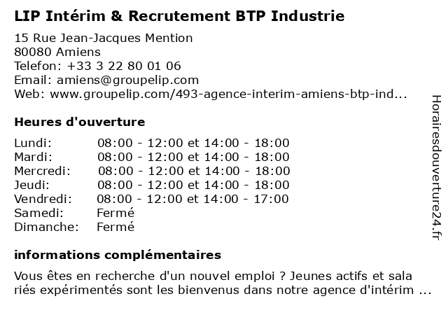 1 R.A.S Intérim Amiens (Distance: 0,02 km) 5 Rue Jean-Jacques Mention, 80000 Amiens amiens, intérim, r.a.s 2 Agence d'Intérim Manpower Amiens Tertiaire (Distance: 0,03 km) 3 Rue Jean-Jacques Mention, 80000 Amiens agence, agence de recrutement, agence intérim, agence pour l'emploi, amiens, cabinet de recrutement, cdi, d'intérim, intérim, manpower, recrutement, tertiaire 3 Agence d'Intérim Manpower Amiens (Distance: 0,03 km) 3 Rue Jean-Jacques Mention, 80000 Amiens agence, agence de recrutement, agence intérim, agence pour l'emploi, amiens, cabinet de recrutement, cdi, d'intérim, intérim, manpower, recrutement 4 Agence d'Intérim Manpower Amiens BTP (Distance: 0,03 km) 3 Rue Jean-Jacques Mention, 80000 Amiens agence, agence de recrutement, agence intérim, agence pour l'emploi, amiens, btp, cabinet de recrutement, cdi, d'intérim, intérim, manpower, recrutement 5 Interaction Intérim (Distance: 0,62 km) . Rue Roger Dumoulin, 80080 Amiens agence, aide, emploi, interaction, intérim, offres, partiel, temporaire 6 SOS Amiens Intérim (Distance: 4,32 km) 9 rue Léon Blum, 80004 Amiens amiens, emploi, intérim, professionnels, recrutement, réseau agence, service, sos |