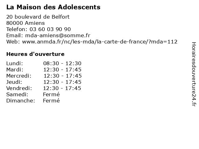 1 La Maison des Adolescents (Distance: 0,00 km) 20 boulevard de Belfort, 80000 Amiens accueil, adolescent, adolescents, aide, anonymat, association, de, des, difficulte, gratuit, l'adolescent, la, maison, multidisciplinaire, parler, prevention, psychologique, sante, solitude 2 Clinique Du Campus - emeis (Distance: 3,28 km) Chemin des Foulons, 80480 Amiens campus, clinique, clinique spécialisée, du, emeis, gérontopsychiatrie, hospitalisation complète, hospitalisation de jour, hospitalisation de nuit, médecin psychiatre, projet de soins individualisé, psychiatrie générale adulte, psychologue, pôle adolescent - jeune adulte, santé mentale 3 Les Opticiens Mutualistes (Distance: 29,08 km) - de l'Authie, 80600 DOULLENS lentilles, les, marques, mutualistes, opticiens, vision et prevention 4 La Maison des Adolescents (Distance: 41,16 km) 9 avenue du Général Leclerc, 80100 Abbeville accueil, adolescent, adolescents, aide, anonymat, association, de, des, difficulte, gratuit, l'adolescent, la, maison, multidisciplinaire, parler, prevention, psychologique, sante, solitude 5 Pole de prevention et d'education du patient (secrétariat ) (Distance: 51,74 km) 40 Avenue leon blum, 60000 Beauvais consultation, d'education, de, docteur, du, et, médecins, patient, pole, prevention, santé, secrétariat 6 CSPA - Centre de Soins Psychothérapiques pour Adolescents La Parenthèse (DAINVILLE) (Distance: 54,03 km) . Rue de Whitstable, 62000 Dainville adolescents, centre, cspa, dainville, de, docteur, la, medecins, parenthèse, pour, psychothérapiques, sante, soins |