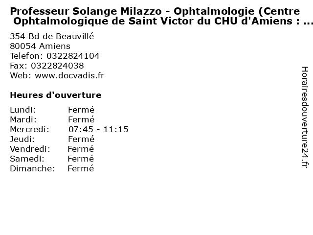 1 Professeur Solange Milazzo - Ophtalmologie (Consultation sur rendez-vous Centre Ophtalmologique de Saint Victor du CHU d'Amiens retine) (Distance: 0,00 km) 354 Bd de Beauvillé, 80054 Amiens centre, chu, consultation, d'amiens, de, docteur, du, medecins, milazzo, ophtalmologie, ophtalmologique, professeur, rendez, retine, saint, santé, solange, sur, victor, vous 2 Professeur Solange Milazzo - Ophtalmologie (Centre Ophtalmologique de Saint Victor du CHU d'Amiens : Neuro-Ophtalmologie) (Distance: 0,00 km) 354 Bd de Beauvillé, 80054 Amiens centre, chu, consultation, d'amiens, de, docteur, du, medecins, milazzo, neuro, ophtalmologie, ophtalmologique, professeur, saint, santé, solange, victor 3 Professeur Solange Milazzo - Ophtalmologie (Centre Ophtalmologique de Saint Victor du CHU d'Amiens : Cataracte, Glaucome) (Distance: 0,00 km) 354 Bd de Beauvillé, 80054 Amiens cataracte, centre, chu, consultation, d'amiens, de, docteur, du, glaucome, medecins, milazzo, ophtalmologie, ophtalmologique, professeur, saint, santé, solange, victor 4 Centre Ophtalmologique de Saint Victor du CHU d'Amiens - Ophtalmologie (secrétariat) (Distance: 0,00 km) 354 Bd de Beauvillé, 80054 Amiens centre, chu, consultation, d'amiens, de, docteur, du, ophtalmologie, ophtalmologique, saint, santé, secrétariat, victor 5 CHU Amiens Picardie - Centre Saint Victor (Amiens) (Distance: 1,12 km) 1 Bd Beauville, 80054 Amiens amiens, centre, chu, docteur, medecins, picardie, saint, sante, victor 6 Crèche familiale du CHU d'Amiens (Distance: 1,62 km) n/a Place Victor Pauchet, 80000 Amiens caregivers houses, child care, chu, crèche, d'amiens, du, familiale, family home, home care, kindergartens, micro-nurseries, parental home |