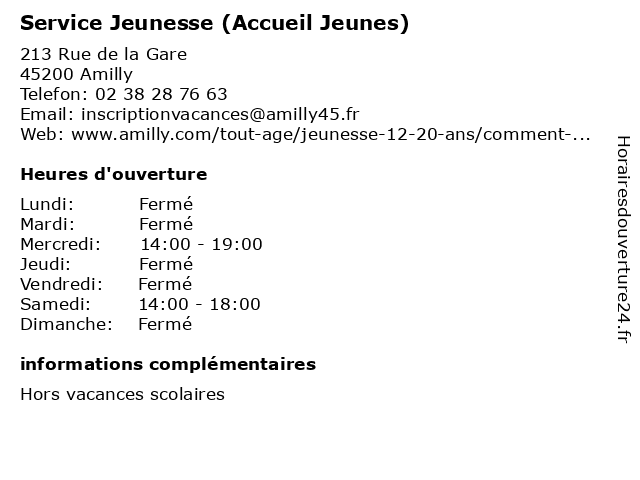 1 Service Jeunesse (Permanences Administratives) (Distance: nan km) 213 Rue de la Gare, 45200 Amilly activités, administratives, espace, jeunes, jeunesse, loisirs, permanences, service 2 Point Information Jeunesse (Distance: 0,00 km) 213 Rue de la Gare, 45200 Amilly administration, assoc, information, jeunesse, point, services, services publics 3 Fitness Park - Accueil (Distance: 2,79 km) 577 Rue Saint-Firmin des Vignes, 45200 Amilly accueil, fitness, musculation, park, salle, sport 4 Caisse Primaire D'Assurance Maladie (Accueil téléphonique) (Distance: 3,46 km) . Rue Crowborough, 45200 Montargis accueil, administration, assoc, caisse, d'assurance, maladie, primaire, services, services publics, téléphonique 5 Point Information Jeunesse (Accueil Ouvert Pendant) (Distance: 3,97 km) 9 Rue du Bon-Guillaume, 45200 Montargis accueil, administration, assoc, information, jeunesse, ouvert, pendant, point, services, services publics 6 |