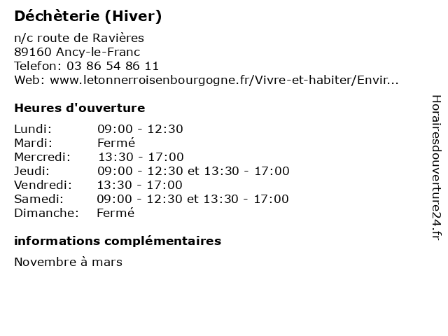 1 Déchèterie (Hiver) (Distance: 13,88 km) - route départementale 952, 89430 Rugny bennes, débarras, déchèterie, détritus, hiver, ordures 2 Déchèterie (Hiver) (Distance: 13,97 km) - ZI de Vauplaine, 89700 Tonnerre bennes, débarras, déchèterie, détritus, hiver, ordures 3 Déchèterie (Hiver) (Distance: 17,62 km) n/c route de Griselle, 21330 Laignes bennes, débarras, déchèterie, détritus, hiver, mars, octobre, ordures, poubelles 4 Déchèterie (Été) (Distance: 0,00 km) n/c route de Ravières, 89160 Ancy-le-Franc bennes, débarras, déchèterie, détritus, ordures, été 5 Déchèterie (Été) (Distance: 13,88 km) - route départementale 952, 89430 Rugny bennes, débarras, déchèterie, détritus, ordures, été 6 Déchèterie (Été) (Distance: 13,97 km) - ZI de Vauplaine, 89700 Tonnerre bennes, débarras, déchèterie, détritus, ordures, été |