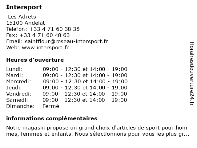 1 Intersport (Distance: 1,28 km) n/a Montplain, 15100 Saint Flour beaute, chaussures, decoration, intersport, mode enfants, mode femme, mode homme, restauration, service, sport 2 Intersport Montagne (Distance: 25,01 km) - Prairie des sagnes, 15300 Super Lioran glisse, hiver, intersport, loisirs, matériel, montagne, neige, randonnées, ski, sport, sports, équipement 3 Intersport Montagne (Distance: 25,67 km) - Immeuble Les Flocons, 15300 Laveissiere glisse, hiver, intersport, loisirs, matériel, montagne, neige, randonnées, ski, sport, sports, équipement 4 Intersport (Distance: 40,58 km) n/a Route de Clermont, 43100 BRIOUDE - COHADE accessoires, intersport, magasin, prêt à porter, running, sport 6 Intersport Montagne (Distance: 55,08 km) 45 Avenue de Sancy, 63610 Super-Besse glisse, hiver, intersport, loisirs, matériel, montagne, neige, randonnées, ski, sport, sports, équipement |