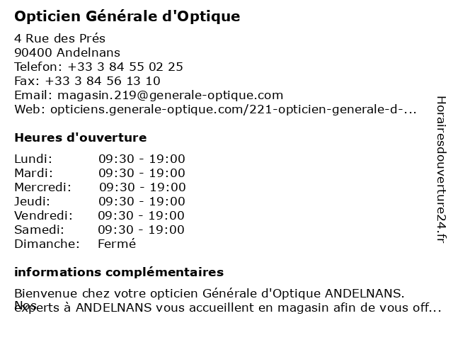 1 Opticien Générale d'Optique (Distance: 4,34 km) 1 BOULEVARD CARoute NationaleOT, 90000 Belfort d'optique, générale, opticien 2 Damien l'Opticien (Distance: 0,63 km) 1 bis Rue des étangs, 90400 Andelnans andelnans, damien, l'opticien, optique 3 Opticien Andelnans - Optic 2000 - Centre Commercial Cora (Distance: 0,95 km) 13 Route de Montbéliard, 90400 Andelnans 2000, andelnans, centre, commercial, cora, lentilles de contact, lunettes de soleil, lunettes de vue, optic, optic2000, opticien, opticien optic2000, ray-ban, rayban 4 Courtot Mécanique Générale (Distance: 2,31 km) 5 Rue des Tilleuls, 90800 Argièsans courtot, générale, mécanique 5 Opticien BELFORT Optical Center (Distance: 2,32 km) 9 Boulevard Henri Dunant, 90000 Belfort belfort, center, optical, opticien 6 Opticien BELFORT Générale d'Optique (Distance: 2,41 km) 1 Avenue du Général de Gaulle, 90008 Belfort belfort, d'optique, examen de la vue, générale, lentilles de contact, lentilles progressives, lunette ray ban, lunettes, lunettes anti-lumière bleue, lunettes de conduite de nuit, lunettes de conduites de nuit, lunettes de soleil, lunettes de soleil pour enfant, lunettes de soleil pour femme, lunettes de soleil pour homme, lunettes de vue, lunettes de vue femme, lunettes de vue homme, lunettes progressives, opticien, opticien proche de chez moi, optique, sport à la vue, vérification de la vue |