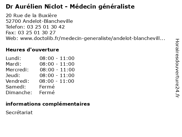 2 Dr Dimitri Plubel - Médecin généraliste (Distance: 0,00 km) 20 Rue de la Buxière, 52700 Andelot-Blancheville dimitri, docteur, dr, generaliste, généraliste, medical, médecin, plubel, soin 3 Groupe Medical de Froncles (secrétariat ) (Distance: 12,98 km) 3 Rue Maurice Paillot, 52320 Froncles consultation, de, docteur, froncles, groupe, medical, médecins, santé, secrétariat 4 Etablissement Francais Du Sang (Distance: 18,38 km) 35 avenue des Etats-Unis, 52000 Chaumont blood donations, du, etablissement, francais, hospital, medical, office, practical advice, sang 5 cabinet medical - Médecine générale (secrétariat ) (Distance: 24,43 km) 28 Rue du Commandant Charcot, 35500 Vitre cabinet, consultation, docteur, générale, medical, médecine, santé, secrétariat 6 Delphine Oberlinger - Sage-femme (Distance: 30,84 km) 25 Avenue de Langres, 52140 Val-de-Meuse delphine, femme, medical, oberlinger, sage, sagefemme |