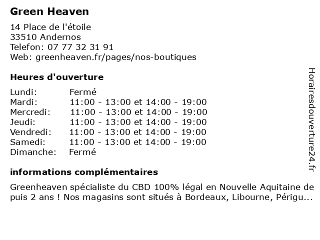 | Mercredi | 11:00-13:00 et 14:00-19:00 |