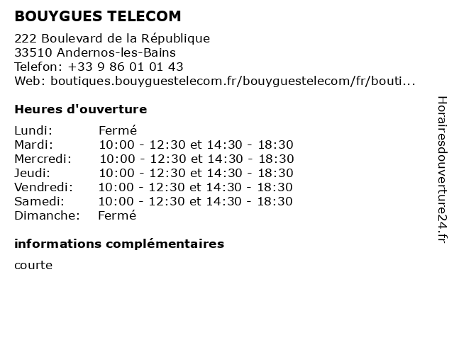1 BOUYGUES TELECOM (Distance: 3,38 km) Avenue de Bordeaux, 33740 Arès 5g, accessoires, acheter téléphone, apple, boutique bouygues telecom, bouygtel, bouygue, bouygue telecom, bouygues, bouygues telecom, bouygues telephone, bouygues télécom, bouyguestelecom, box internet, fibre, fibre optique, fixe, forfait mobile, fournisseur d'accès à internet, internet, internet haut débit, iphone, magasin bouygues, offres fixes, offres groupées, offres internet, opérateur, opérateur fixe, opérateur mobile, raccordement fibre optique haut débit (ftth), reprise mobile, réparation mobile, samsung, samsung galaxy, smartphones, telecom, télécommunication, téléphonie, téléphonie fixe, télévision 2 Bouygues Telecom (Distance: 10,60 km) 48 Avenue Lamartine,, 33120 Arcachon accessories, bouygues, connections, gadgets, internet, mobile, phones, telecom, téléphonie 3 BOUYGUES TELECOM (Distance: 14,35 km) 1060 Avenue de l'Europe, 33260 La Teste-de-Buch bouygues, fai, fournisseur d'accès internet, telecom, téléphonie mobile 4 BOUYGUES TELECOM (Distance: 15,89 km) 71 Rue des Fonderies, 33380 Biganos bouygues, fai, fournisseur d'accès internet, telecom, téléphonie mobile 5 Coriolis Telecom (Distance: 0,06 km) 42 Avenue Du General De Gaulle, 33510 Andernos coriolis, magasins, mobiles, services, telecom 6 BOUYGUES TELECOM (Distance: 36,19 km) 17 Avenue de la Somme, 33700 Mérignac bouygues, fai, fournisseur d'accès internet, telecom, téléphonie mobile |