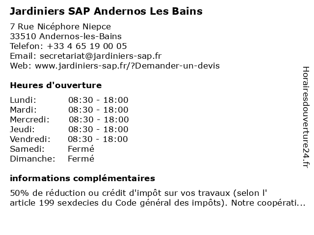 1 Jardiniers SAP (Distance: 0,13 km) Avenue des Frères Montgolfier, 33510 Andernos-les-Bains jardiniers, sap 3 Jardiniers SAP Audenge (Distance: 10,79 km) 10 Rue du Maréchal Juin, 33980 Audenge audenge, jardiniers, sap 4 Jardiniers SAP Lege Cap Ferret (Distance: 12,48 km) Avenue du Truc Vert, 33950 Lège-Cap-Ferret cap, ferret, jardiniers, lege, sap 6 Jardiniers SAP Biganos (Distance: 14,96 km) 16 Rue des Gaillards, 33380 Biganos biganos, jardiniers, sap |