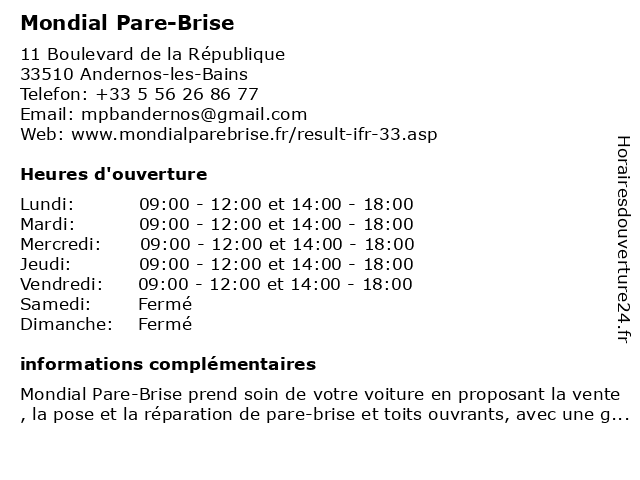 1 Mondial Pare-Brise (Distance: 3,45 km) 26 Avenue Gutenberg, 33510 Andernos-les-Bains brise, mondial, pare 2 Mondial Pare-Brise (Distance: 14,17 km) , Avenue Gustave Eiffel, 33260 La Taste de Buch brise, centers, machinery, mondial, optical headlight wipers, pare, rear window, repair, services, side, technical, vehicle, windows, windshield 3 France Pare Brise (Distance: 3,52 km) 7 Rue Panhard-Levassor, 33510 Andernos-les-Bains brise, france, pare 5 France Pare Brise (Distance: 10,42 km) 1 Boulevard Mestrezat, 33120 Arcachon bris de glace, brise, france, pare, pare brise, services 6 Confort Auto - Illico Pare-Brise - Illico Meca (Distance: 12,83 km) 3 allée Charles Perrault, 33470 Gujan-Mestras atelier, auto, automobile, brise, carrosserie, confort, controle, entretien, garage, illico, meca, montage, pare, pneu, réparation |