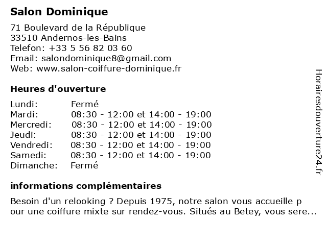 | Samedi | 08:30-12:00 et 14:00-19:00 |